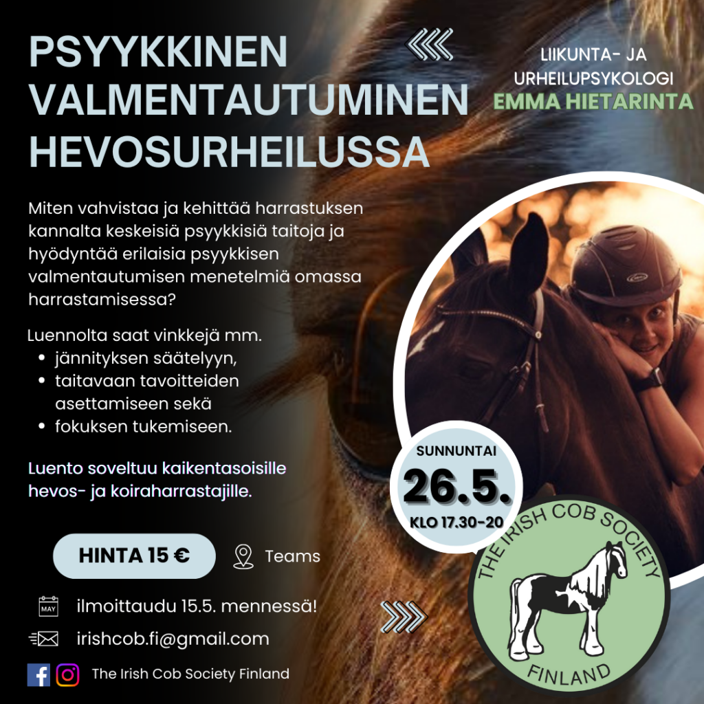 Psyykkinen valmentautuminen hevosurheilussa -luennolla syvennytään toimivan ja mielekkään harrastuksen kannalta keskeisiin psyykkisiin taitoihin ja pohditaan kuinka näitä taitoja on mahdollista itse tietoisesti vahvistaa ja kehittää. Luennolla esitellään erilaisia psyykkisen valmentautumisen menetelmiä ja pohditaan kuinka näitä keinoja voisi hyödyntää ja soveltaa omassa harrastamisessa.