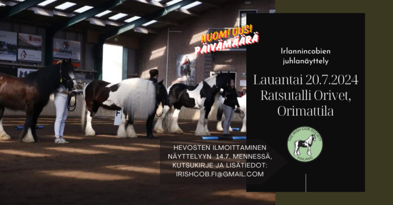 Irlannincobien juhlanäyttely järjestetään 20.7.2024, paikkana Ratsutalli Orivet, Orimattila.